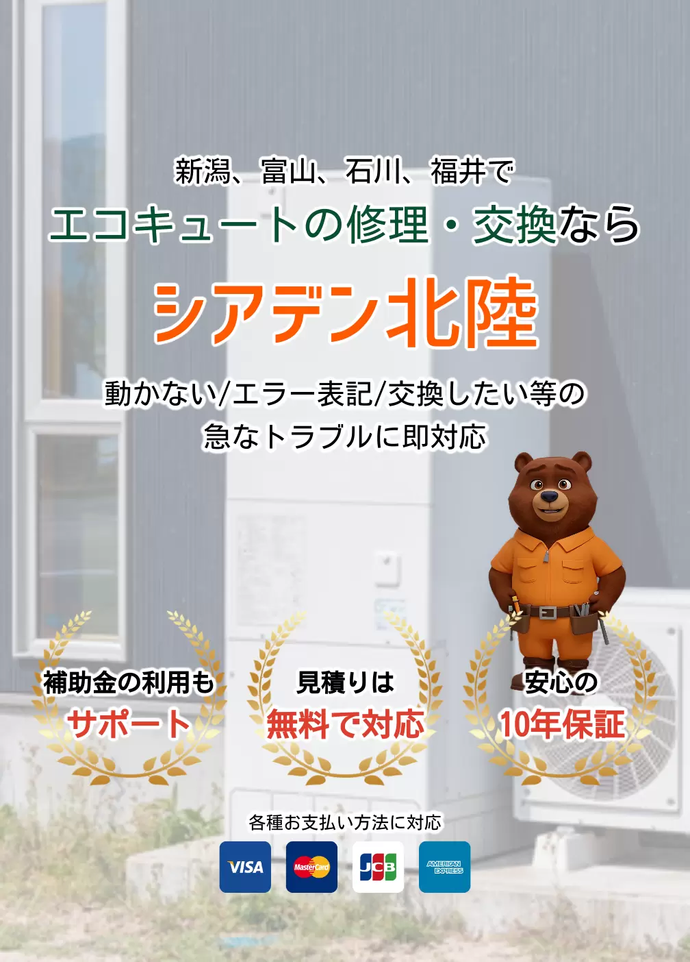 「エラーの表記がある」「電気代が高い」「急に動かなくなった」そんなお悩み、エコキュートのシアデンにおまかせください!私たちは新潟、富山、石川、福井に対応したエコキュートのプロ集団で取付・交換・修理まで、365日休まずスピード対応します。最短即日訪問、適切な価格&プロの技術力で安心のサービスをお届けします。